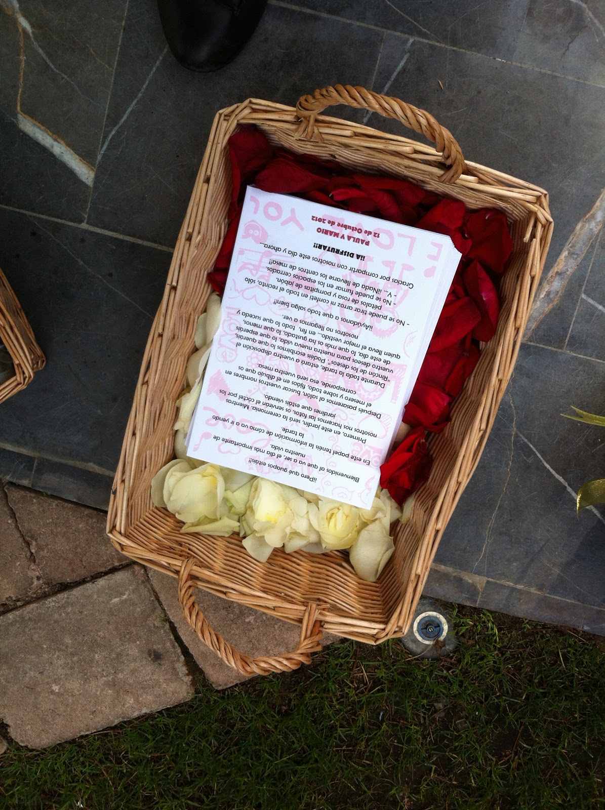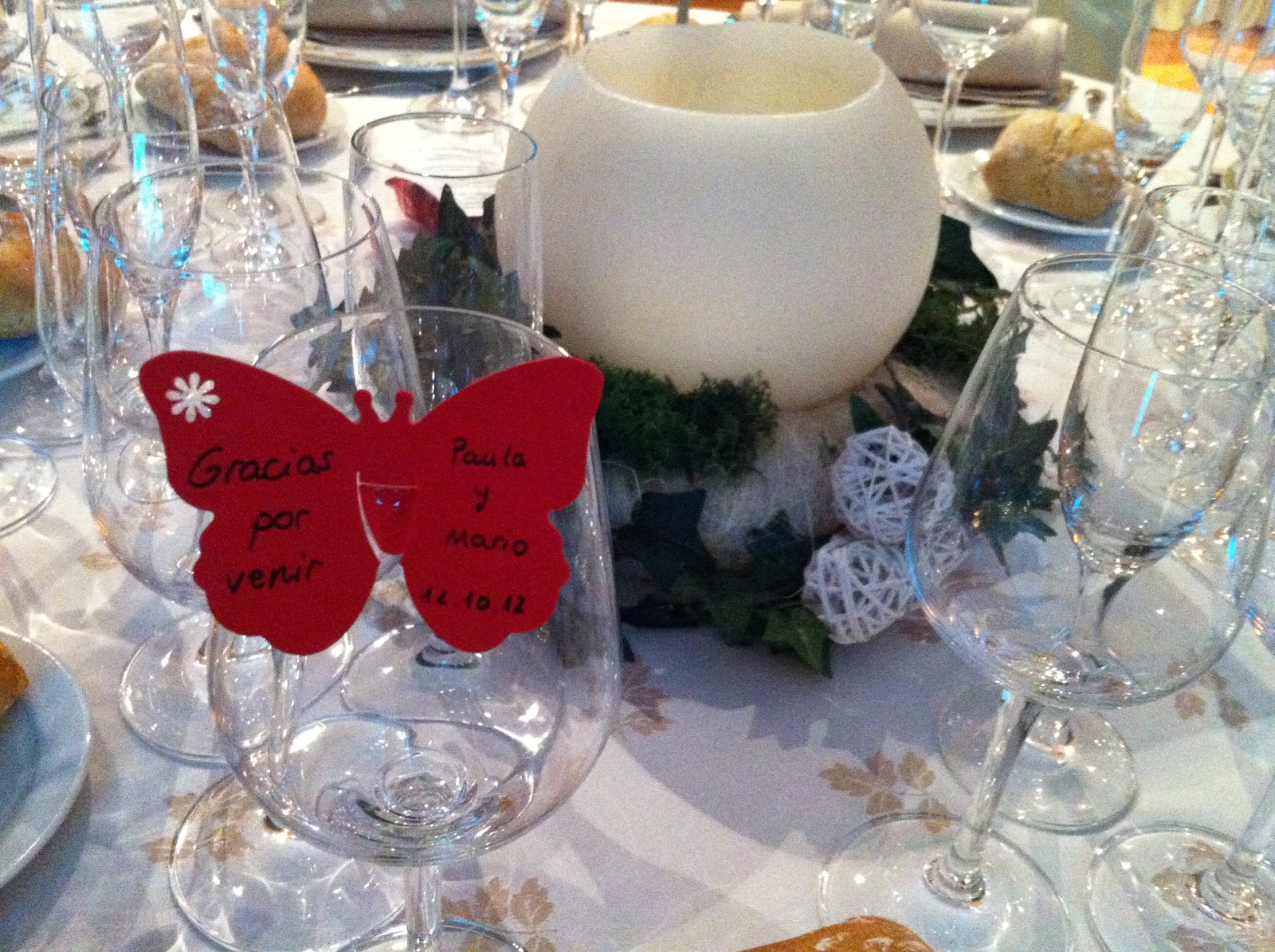 Según fueron llegando los invitados se les repartió un tarjetón dándoles la bienvenida de parte de los novios. Cuando la ceremonia civil estaba acabando se repartieron pétalos a todos los presentes, y también unos pomperos muy graciosos con forma de botellas de cava que causaron sensación.