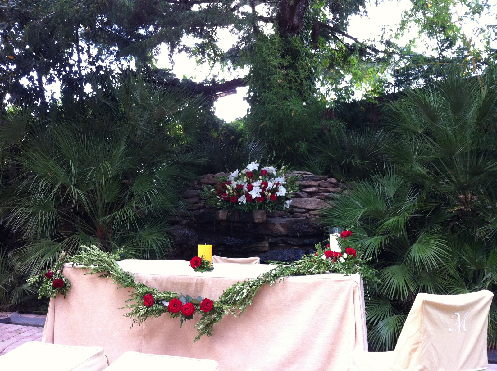 La decoración floral de la ceremonia la realizó El Taller de Dimomo. El montaje tenía como protagonistas las rosas rojas (la flor preferida de la novia), combinadas con rafia y ramas de boj. Quedó súper bonito y muy apropiado para el tipo de espacio que los novios habían elegido para darse el sí quiero.