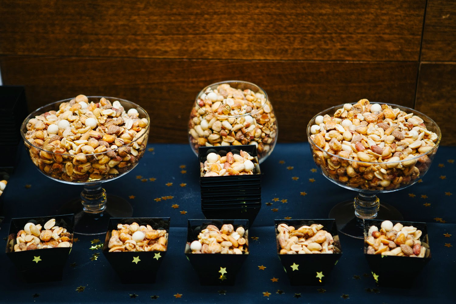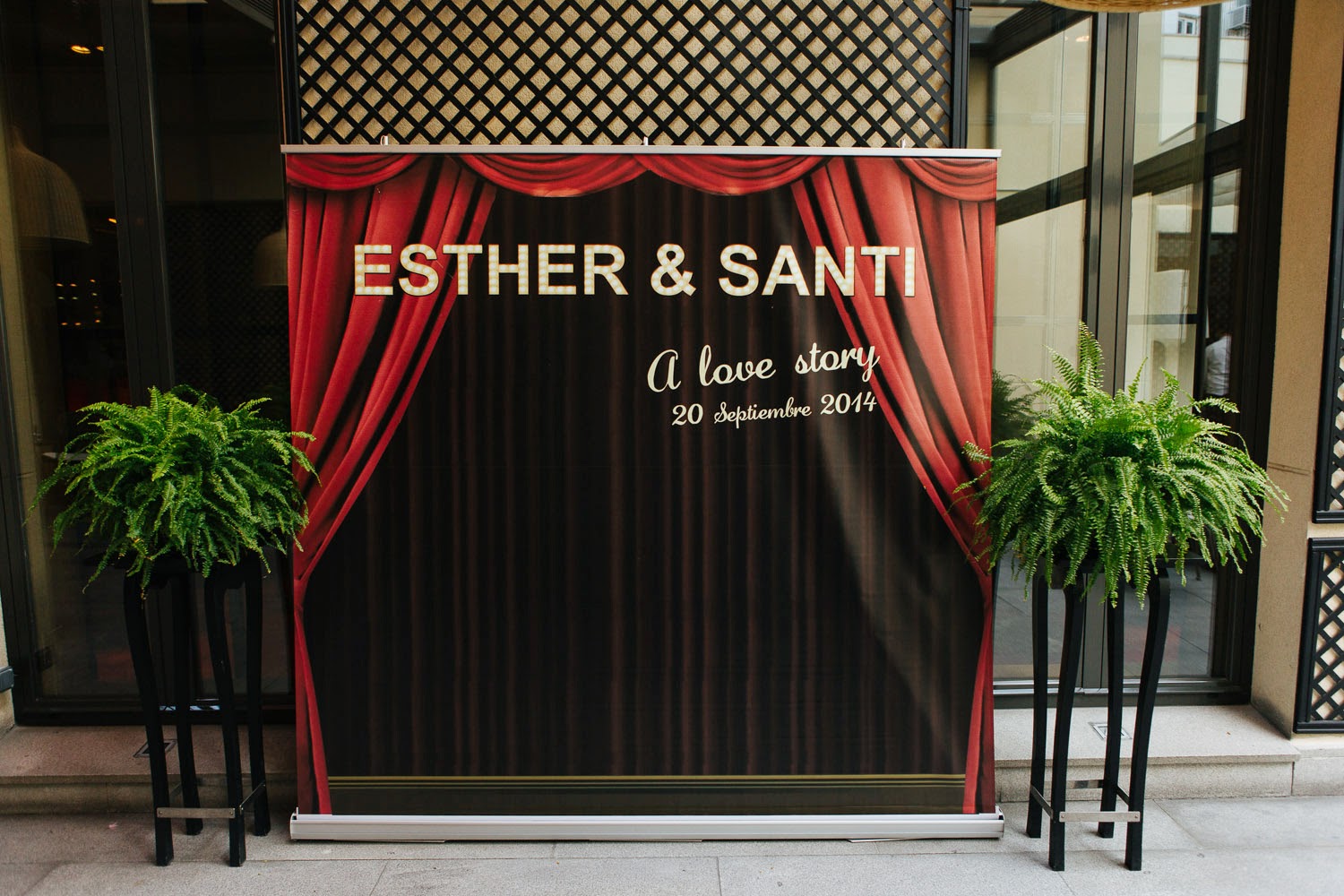 El photocall y la cartelería de la boda es un diseño que hice yo misma a petición de los novios, inspirado en un teatro de Broadway. La decoración general se basó en la utilización de velas en el exterior -ya que la boda se celebró a última hora de la tarde-, y ya en la sala de la fiesta montamos una barra con snacks dulces y salados para acompañar la barra libre, utilizando para completar el conjunto collages con carteles de las películas favoritas de esta pareja.